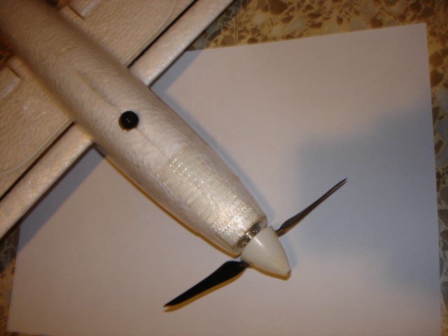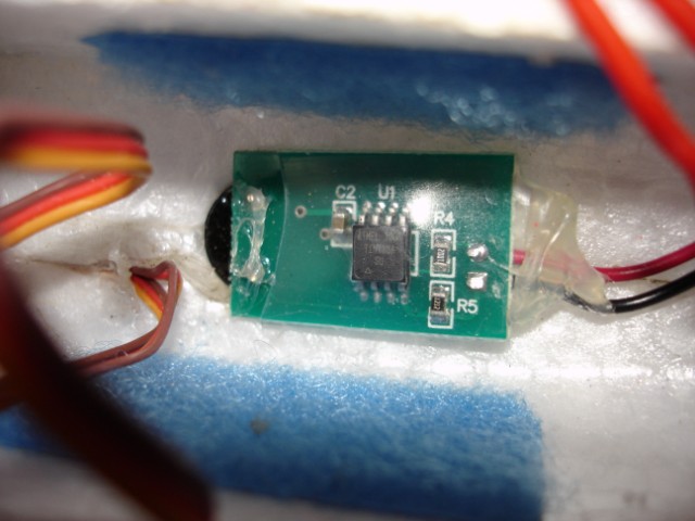 Tan solo con el agujero para el altavoz ya se sostiene el circuito en su lugar. El pegamento que puede apreciarse no está pegado al fuselaje, tan sólo protege por un lado los cables que van a la LiPo, para dificultar que se arranquen y cortocircuiten, y al otro lado aislando donde no llegó el termorretráctil.